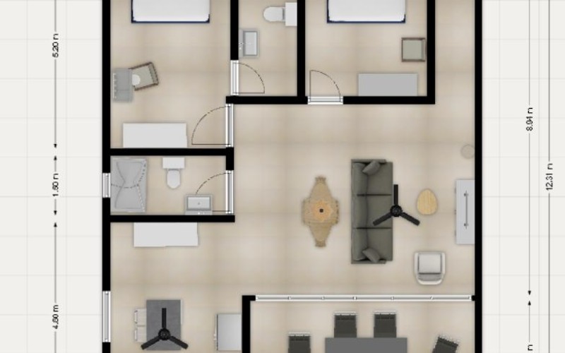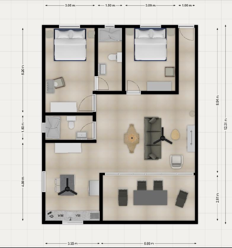 Each apartment spans 114 m² and features 2 spacious bedrooms and 2 luxurious bathrooms. A large sliding glass door connects the bright living area to a private balcony, inviting the island breeze into your home. The open layout includes a designated area for your custom kitchen (kitchen not included). Both bedrooms are equipped with air conditioning, and the master bedroom includes an elegant en-suite bathroom.